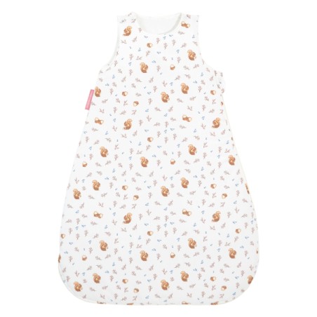 Chaude et douillette, une gigoteuse mixte et intemporelle délicatement imprimée de petites écureuils, cerises et glands de la forêt.