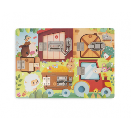Toc toc toc ! Qui est là ? Avec cette jolie planche à verrous sur le thème de la ferme, les enfants découvrent qui se cachent derrière les différentes portes, développant leur curiosité et leur motricité fine. Les enfants adorent manipuler, ouvrir, fermer… avec ce busy-board en bois, c'est l'idéal ! Pour découvrir tous ses secrets, il faudra réussir à ouvrir les 5 portes fermées, chacune équipée d'un système d'ouverture différent : crochet, loquet, entrebâilleur à chaine, attache à bascule et verrou ! Chaque porte de cette planche possède un chiffre unique. Ce chiffre indique combien de bébés animaux se cachent derrière la porte, offrant ainsi une chouette surprise à chaque ouverture ! Cette activité ludique permet d'apprendre à compter et de découvrir les animaux de la ferme et leurs petits, tout en développant la logique et la dextérité. Avec son format plat, l'enfant peut y jouer confortablement sur une table ou au sol. C'est parfait pour jouer seul ou avec un parent pour inventer des histoires autour des animaux. Dimensions : 24,8 x 70 cm. Cette jolie planche d'activités éducatives en bois FSC™ est idéale pour les enfants dès 3 ans.